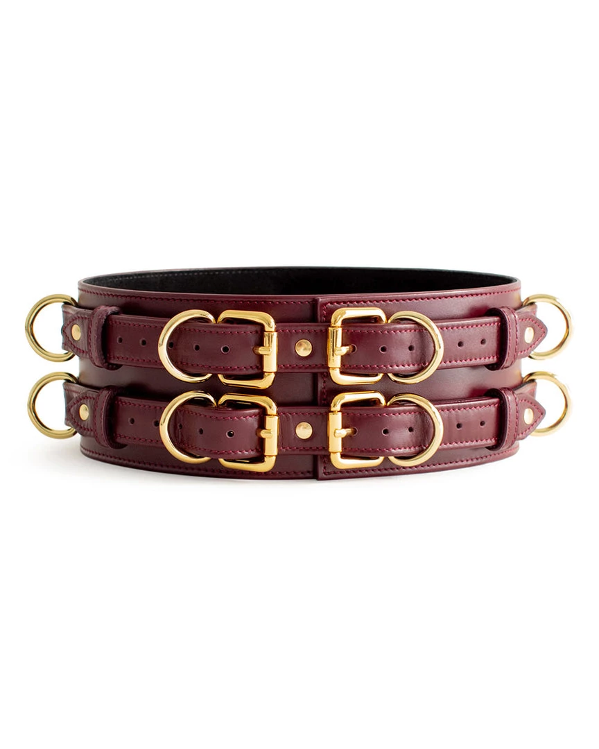 This bondage accessory is made from soft Italian matte leather and has suede lining. The outside is decorated with two thin straps, with which you can adjust its size. Also, on the sides and front, the belt is equipped with D-rings, to which handcuffs, ankle cuffs, and ropes can be attached with the help of double fixations or carabiners. The belt can be worn as a separate fetish accessory.