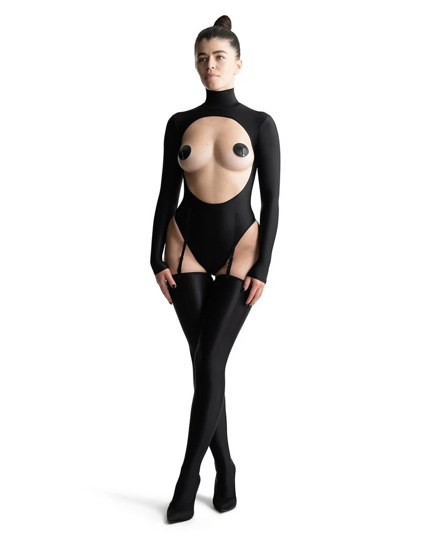SALMA it’s a long-sleeved body with a turtle neck and arousing round cut. Such contradictory nudity catches an eye and makes us moan! The body has two zippers. One hides on the back and another – on the crotch. The rubber band around the cut gives a correct tension along the thorax. Garters for biflex stockings can’t be separeted from SALMA.