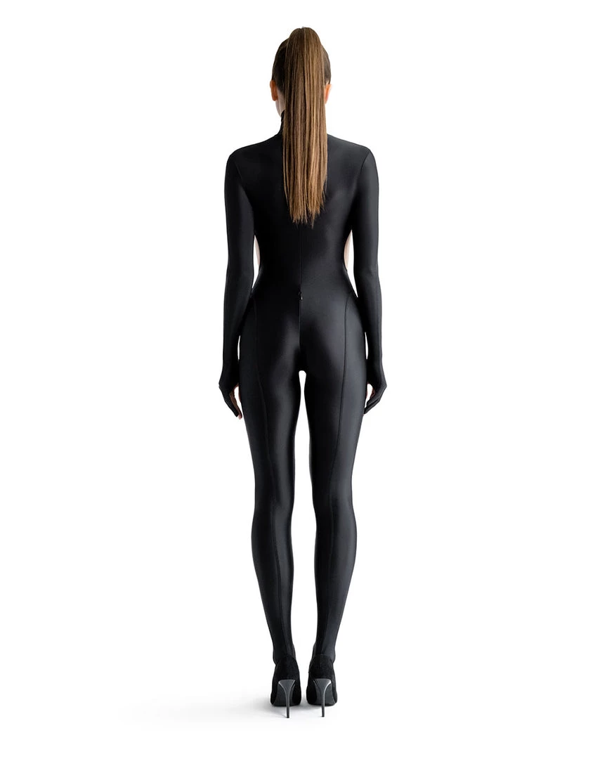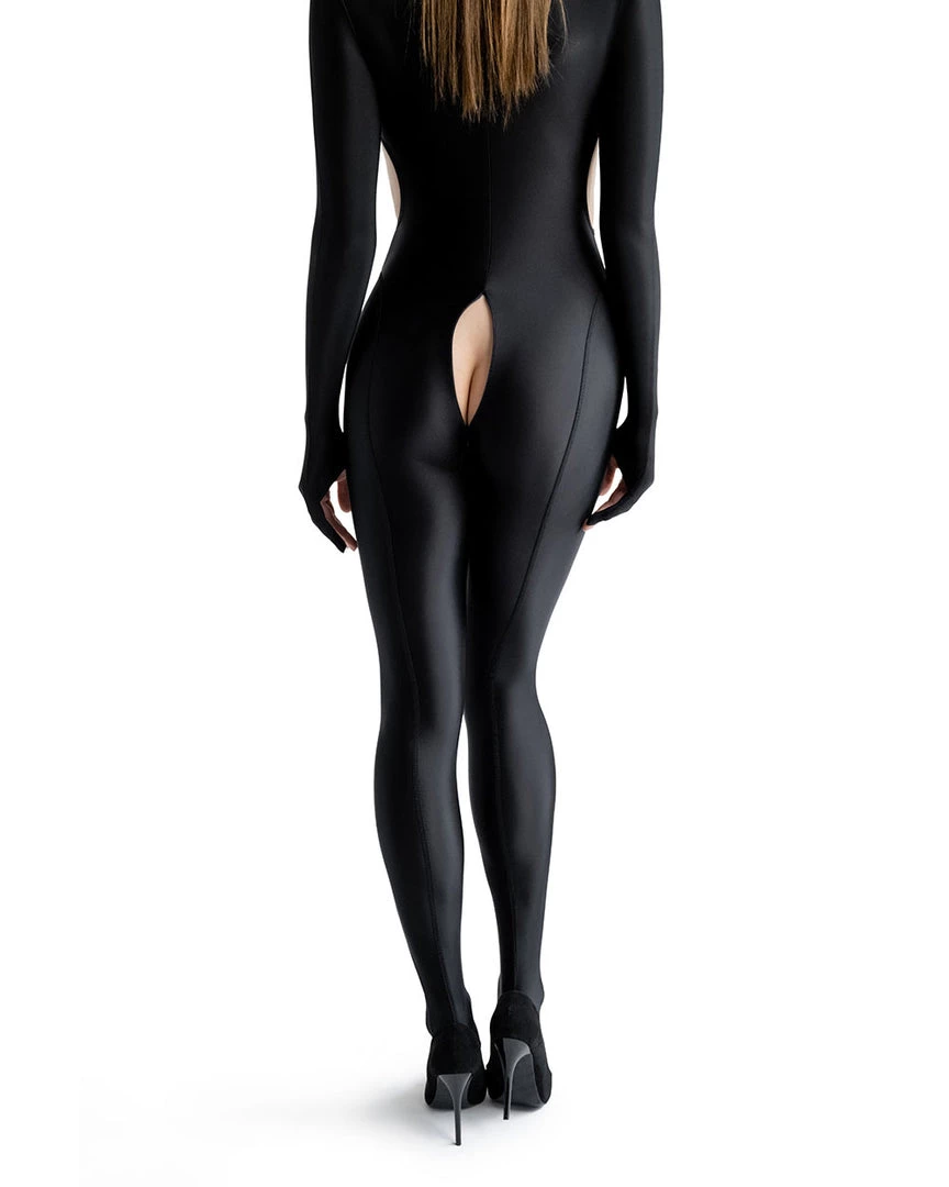 The bodysuit ALEXIS will definitely gain a special place in your wardrobe. It covers almost all of your body in the biflex and mesh fabric. Its gloves cover only two fingers, and small cuts under the ribs emphasize the waist. Also, there are loops for middle fingers on the socks. The bodysuit has 2 zippers. The first one is hidden on the chest and the second between.