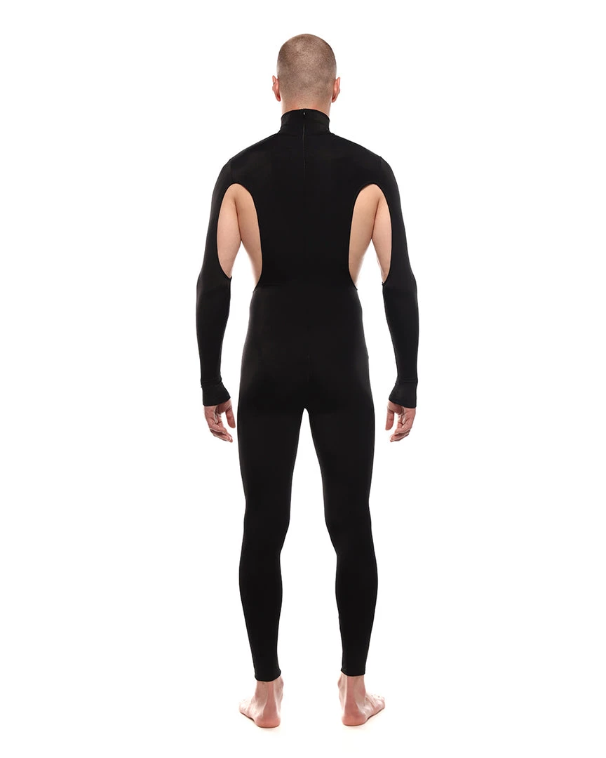 The bodysuit is sewed from the biflex and fits tightly. It has symmetrical cutouts that highlight the arms and the torso. The garment has two zippers: on the back and between the legs.