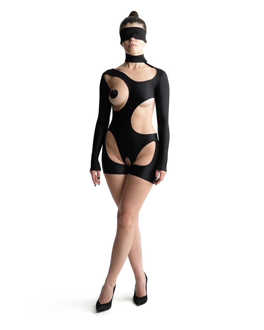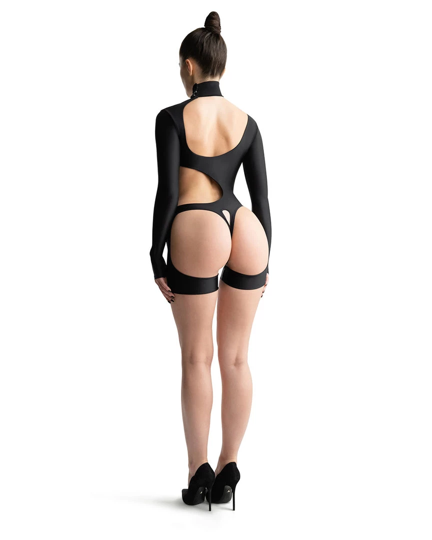 Bodysuit KAYDA is seductive with the hint of brutality. Its design is the perfect balance between nudity and the touch of biflex. The asymmetrical cuts across the shape highlight and open the juiciest parts and curves. You can put the lingerie on through the legs by your desire. It has small hooks on the collar that help you fasten it. The back and front consist of two parts with a stitched elastic. Also, it has a cut located in an intimate spot.