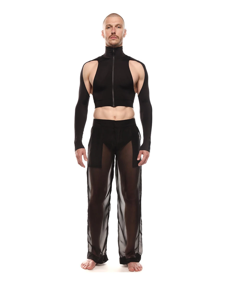 The pants are sewed from light and translucent chiffon. This garment has wide pockets, and the briefs are part of the set. You can fasten the pants using a zipper in the front.