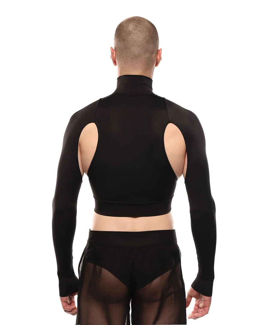The top is sewed from the biflex and fits tight. It has symmetrical cutouts that highlight the arms and wing muscles. The garment has a zipper in the front.