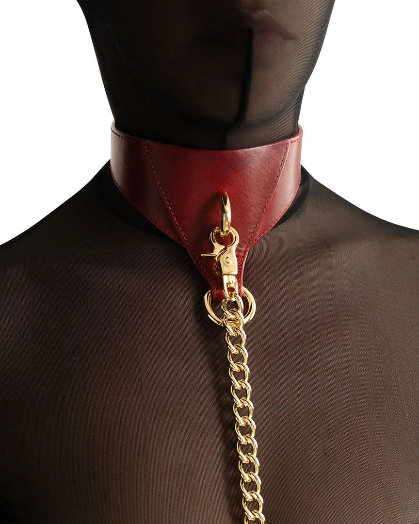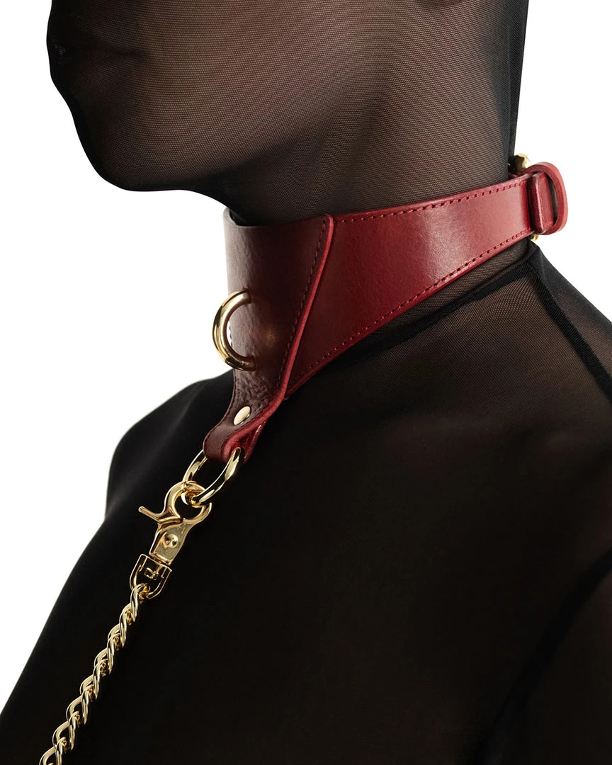 It’s a two-layer collar that softly touches the skin. You can attach a leash (85 cm) to a ring or D-ring. The narrowest part is 2 cm wide, and the widest – 8,5 cm, which creates tension. Regulate the size of the item with a buckle on the back of the collar.
