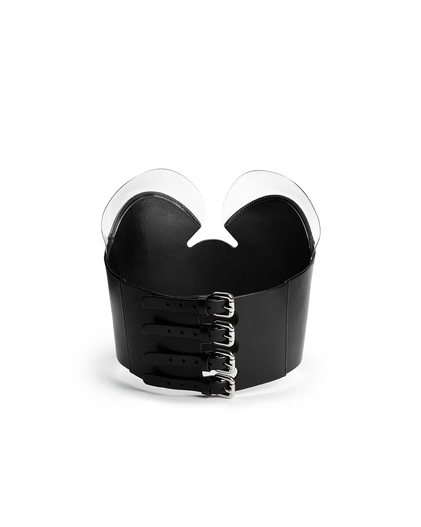 The corset is sewed from full-grain leather with transparent inserts on the cups. Yasmin holds the shape amazingly, emphasizes a smooth waistline, and has an inverted and alluring Y cut. You can fasten the corset with the help of 4 buckles in the back.