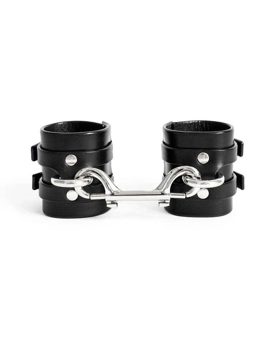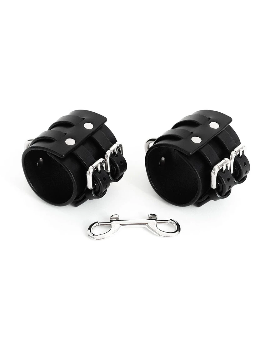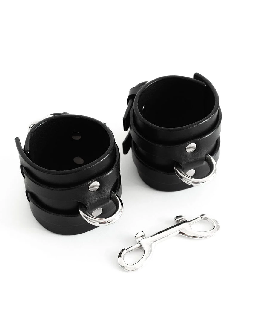 These cuffs are made of full-grain leather and durable nickel-plated hardware that does not scratch the body while using. The fastened cuffs are tightly attached to the body. This set of cuffs includes two carbines, which can be attached to another bondage accessory or ropes.