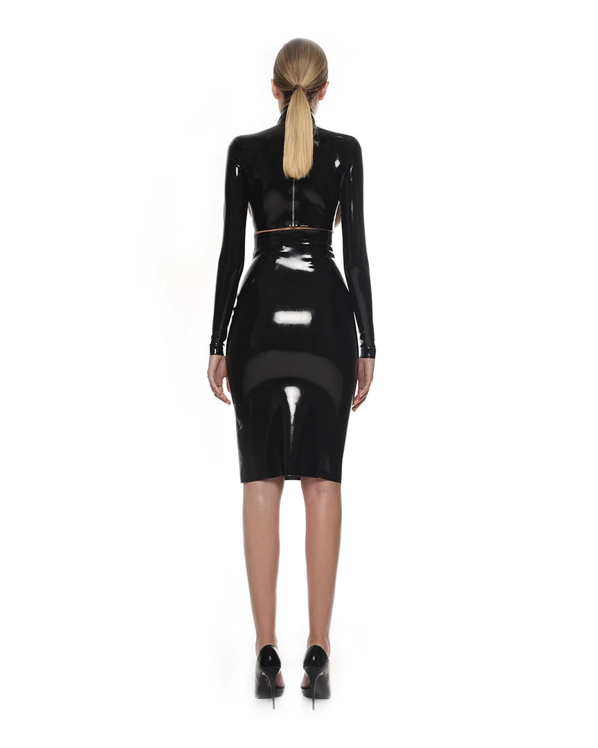 Latex is a super tight material, so if you want to move more freely in the skirt, you can unzip it in the front. On the back of it, there are constructive lines that underline the curves of a figure.