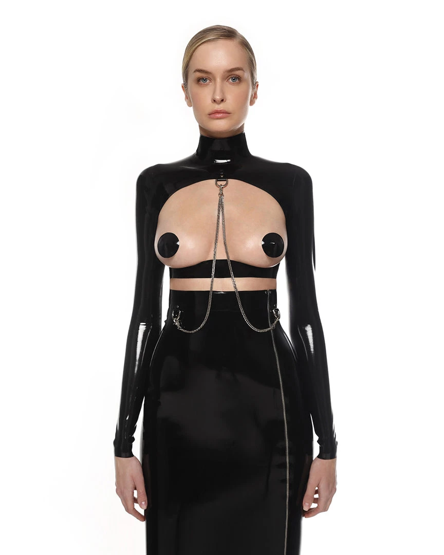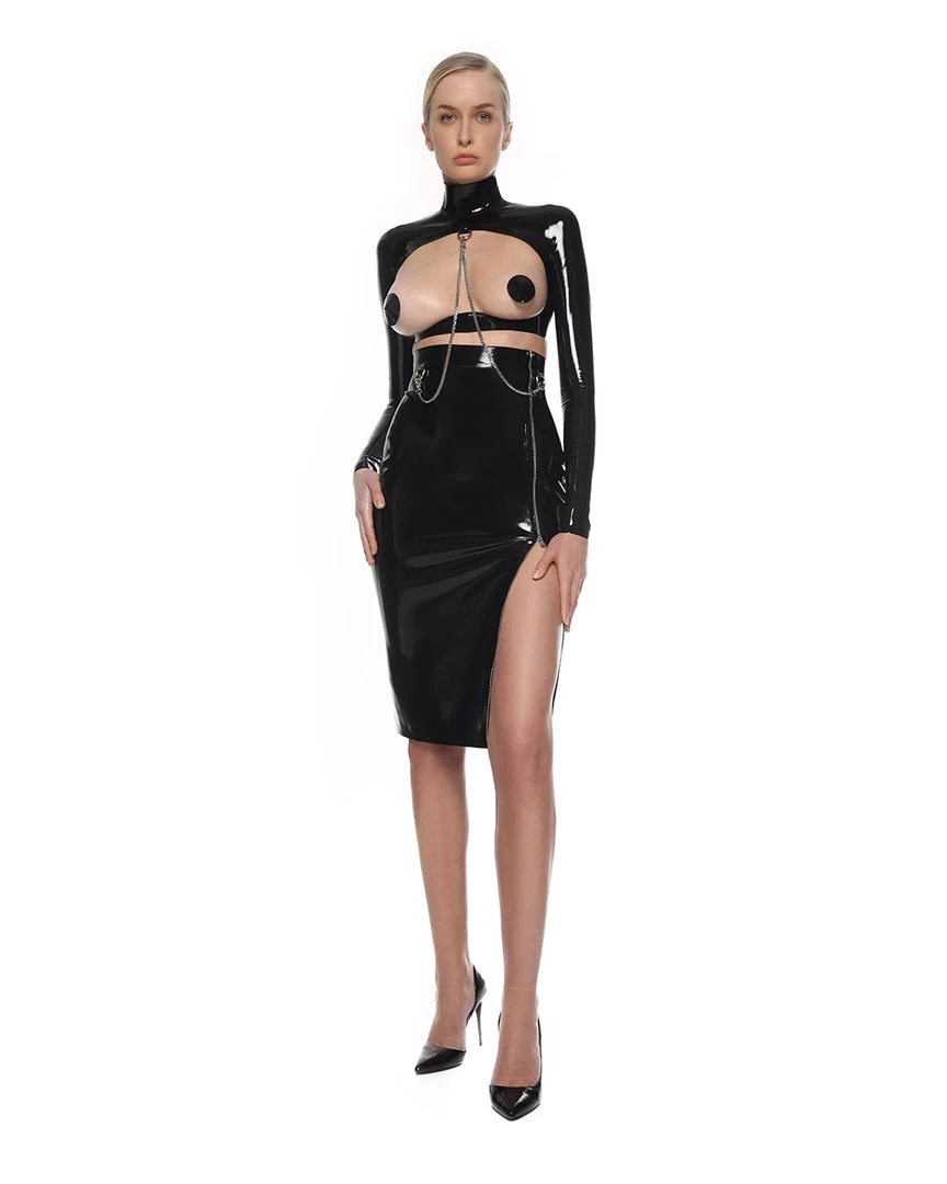 Latex set Stella009 consists of a top and a slim pencil skirt with a high waist. The semicircle cutout on the top immediately catches the eye. But Stella009 has other accents. On the top and skirt, there are nickel-plated rings to which you can attach chains that also have nickel covering.