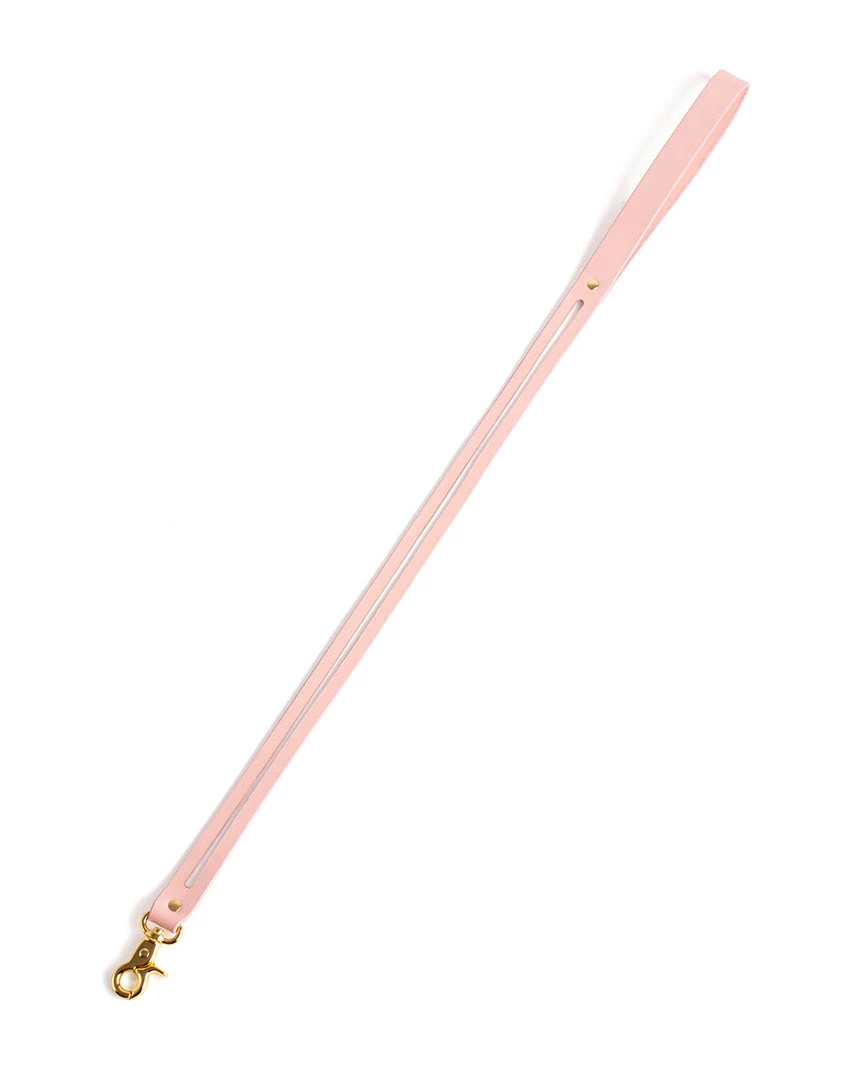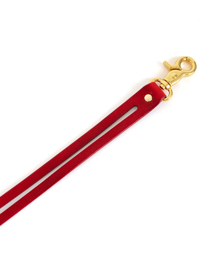 The leash is handcrafted from full-grain leather and nickel-plated hardware. The product consists of a long strap cut out of a whole leather piece. In the center of the product is cut a long strip dividing the leash belt into two narrow straps. A carabiner is attached to the other end of the leash, which allows you to attach it to a collar or other bondage fixations. The edges of the leather parts of the accessory are specially processed to not rub while using.