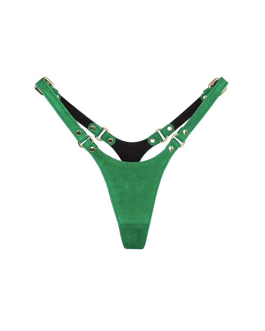 G-sting Nellie is made of suede leather and has suede lining. We recommend cleaning it with special leather care products to maintain the softness of the suede. You can regulate the size of the item with the help of buckles on its sides. The panties are part of a restraint set — Nellie.