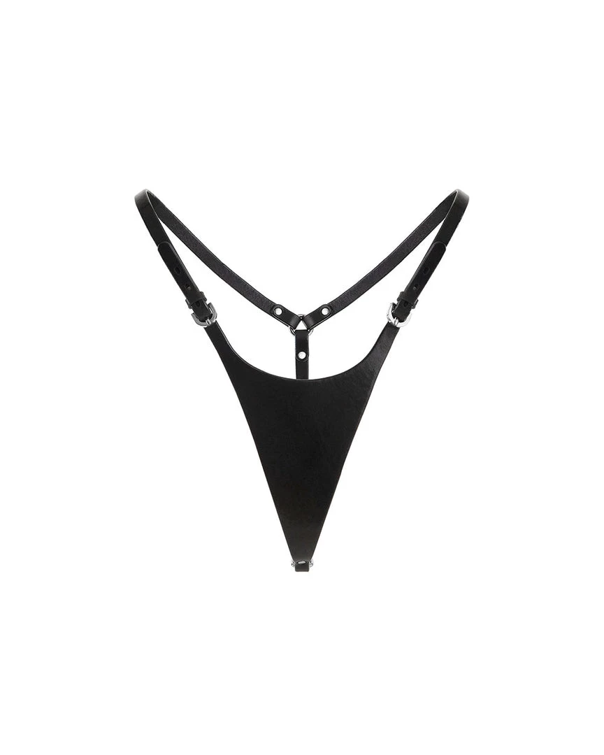 The panties Selena have a simple V-shape and sit on the waist. The straps of Selena are adjustable and fastened with buckles on the front on both sides. The straps go to the back. Their story of seduction ends and culminates on the small ring where all the leather lines come together.
