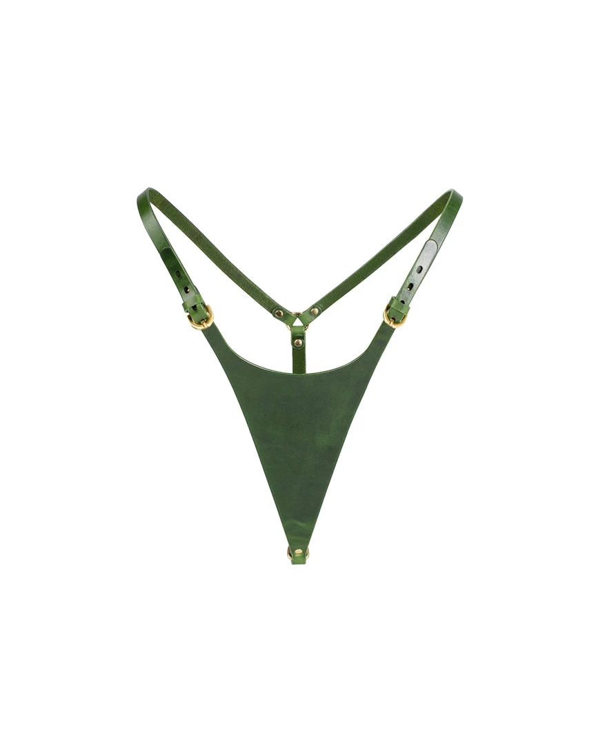The panties Selena have a simple V-shape and sit on the waist. The straps of Selena are adjustable and fastened with buckles on the front on both sides. The straps go to the back. Their story of seduction ends and culminates on the small ring where all the leather lines come together.