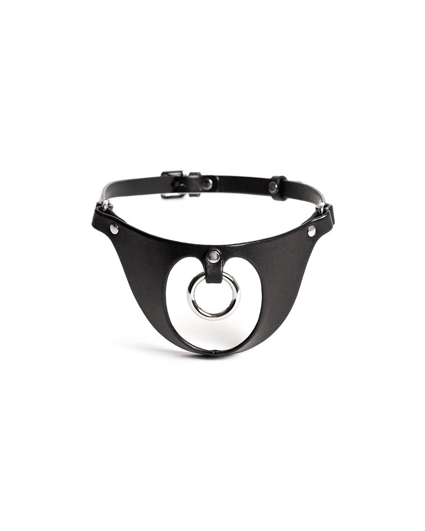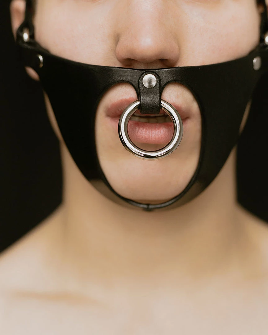 Lin vibrates with danger and submissiveness. The mask goes over the lower part of the face, and its height is 10.5 cm. You can see the ring with a diameter of 2.5 cm in the center. Also, there is a seam at the bottom. Two D-rings that are located on the sides fixate two narrow straps with buckles and adjustments. They clasp the head and fasten at the back, firmly fixing the mask. Lin leaves the mouth open, so, just in case, you can freely say your safe-word.
