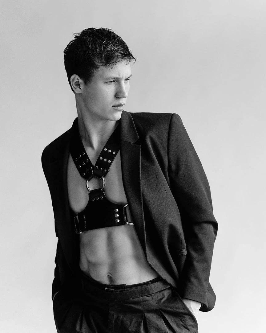 Harness Arwin has the shape of the letter M. The item provokes boldness when it’s on the body and ignites a desire in the eyes of the one who looks at it. It is made from full-grain leather and is decorated with nickel-plated hardware. It consists of two straps and a belt that has the same width as straps. You can fasten and adjust these parts on the back with buckles, which makes the accessory fit different body shapes. The straps embrace shoulders, and the belt goes over serratus anterior muscles. The pieces are connected to the central detail with 3 rings on the upper abdominal. Also, you can use these rings to attach handcuffs to fixate wrists. Arwin’s pretty minimalistic construction is complemented by the 3 rows of decorative rivets.