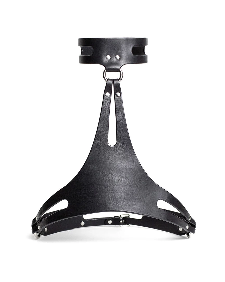 The elements of Trian are quite unique as for a men’s accessory. The central part has the triangle form, the corners of which split and form two narrow straps. They remind us of a snake’s tongue, so the harness has the taste of danger and teases imagination with its appearance. To these small leather branches, the rings are attached. You can use them to fixate wrists, for example. Also, to them is connected the back strap with two buckles in the middle. With their help, you can adjust the size of the harness. Collar’s width is 4.5 cm, and it has decorative cuts that connect in the back with a fastener.