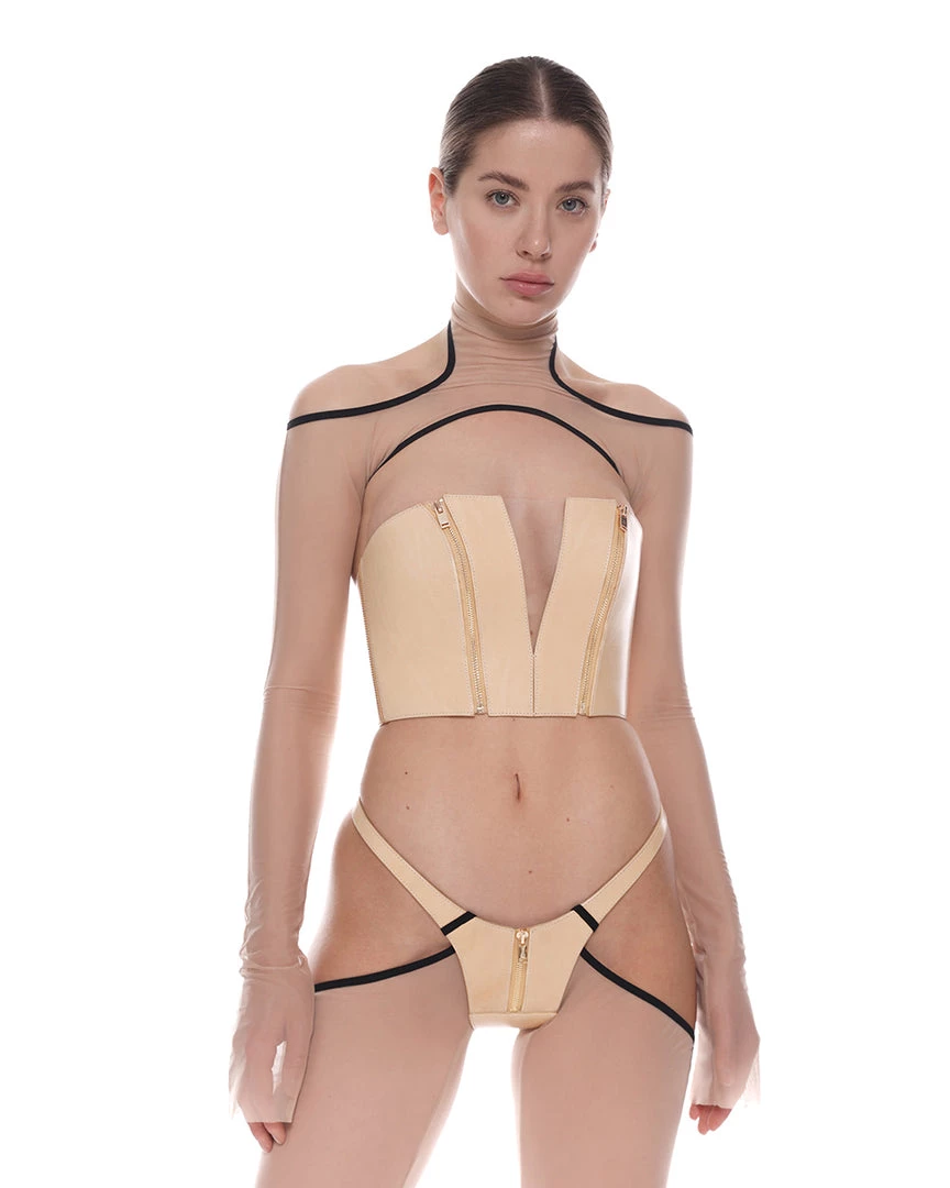 The panties are sewed from full-grain leather with additional lining and have a decorative zipper. You can fasten and regulate the size of the panties with 2 buckles on the back. The garment goes perfectly with the corset Beatrix.