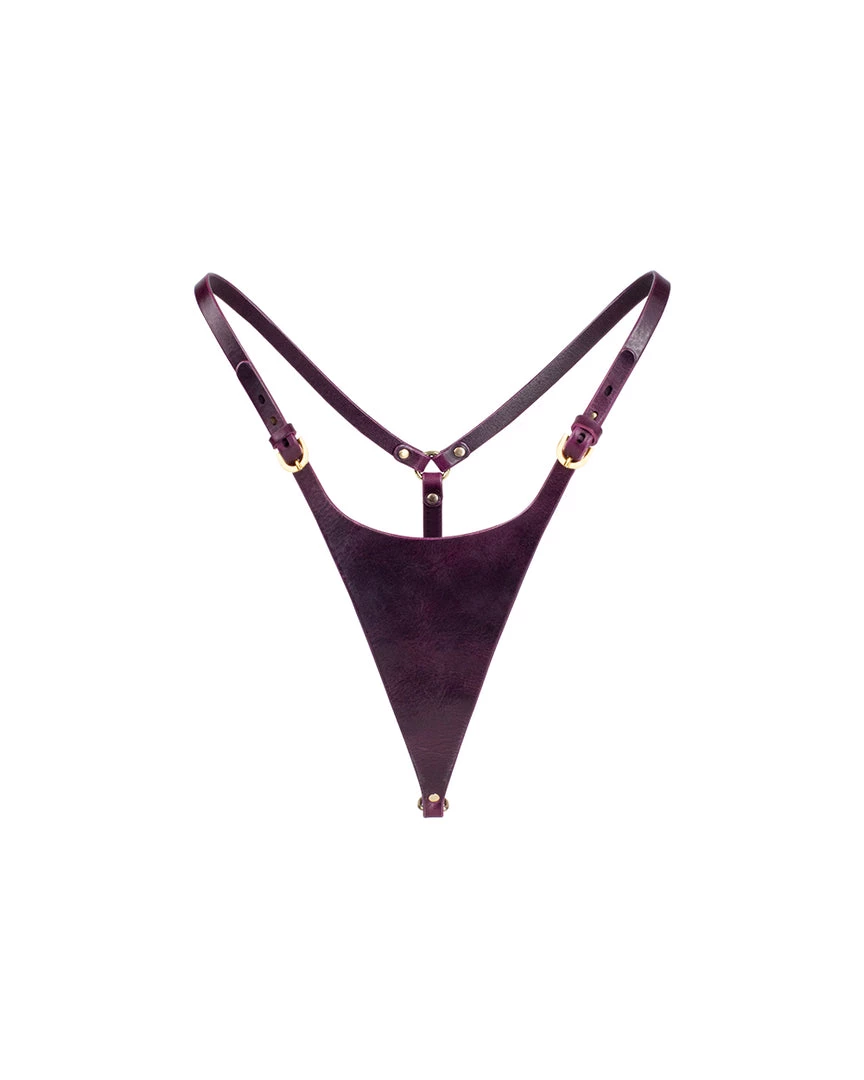 The panties Selena have a simple V-shape and sit on the waist. The straps of Selena are adjustable and fastened with buckles on the front on both sides. The straps go to the back. Their story of seduction ends and culminates on the small ring where all the leather lines come together.