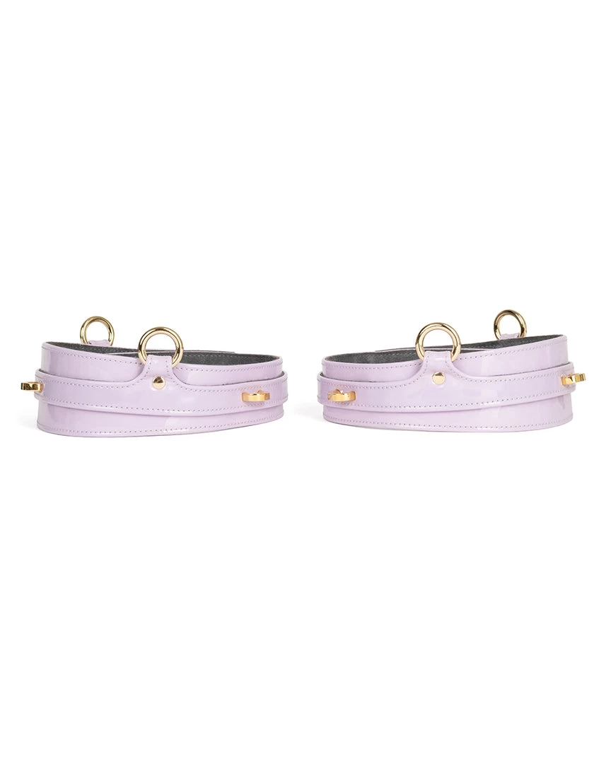 Thigh cuffs Nellie have a base and overlapping strap sewed from patent leather. hey have functional D-rings in the front, back and sides. You can attach chains to them. Regulate the size with the help of buckles on the inner thigh.