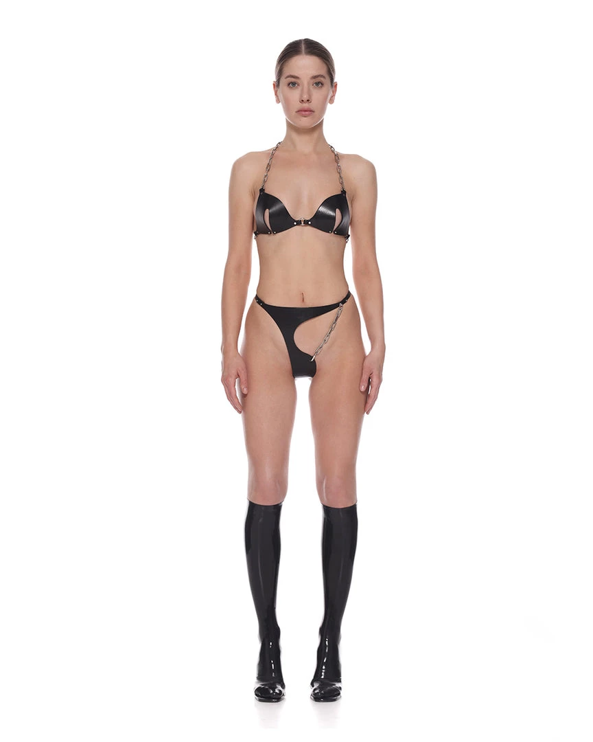 The lingerie set is made of full-grain leather. The bodice cups support the breasts, and you can adjust the height and size using chains. The asymmetrical panties are thong-shaped at the back with smooth wavy edges at the front. You can regulate the size and fasten them at the back using buckles.