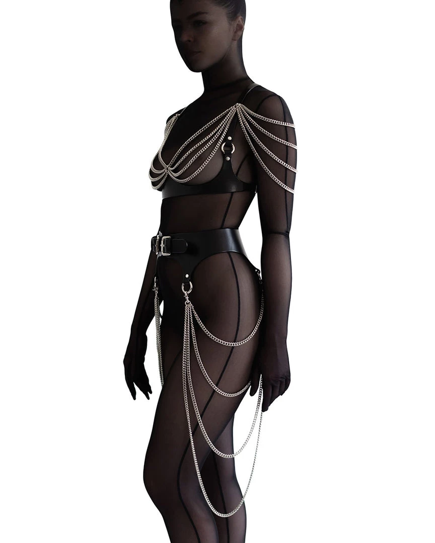 The set Noah is a unique set that consists of a leather bra and a belt. The leather top is made of Italian hard leather. It has a unique and interesting design that supports the breasts from the bottom. Chains on the chest and shoulders emphasize them and give them special sensations. The view of this top from the back – captivates the eyes. You can use it as a separate accessory in casual or erotic images.