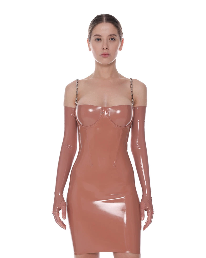 The Stella008 dress is made of premium quality latex. The top of the dress has underwires, like in a bra, that lift the breasts. Also, there are vertical wires on the front and back that prevent seam puckering in the waist area. You can zip up the dress and regulate its height using sliders on the back.