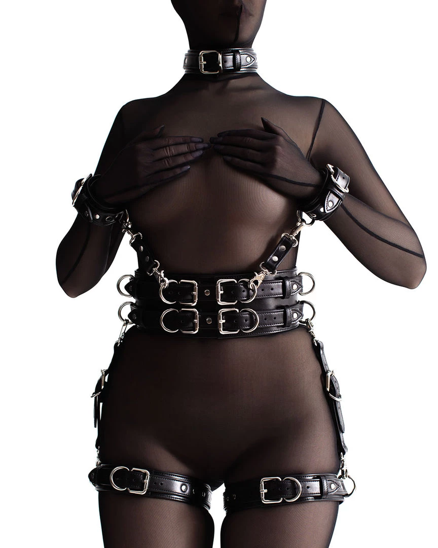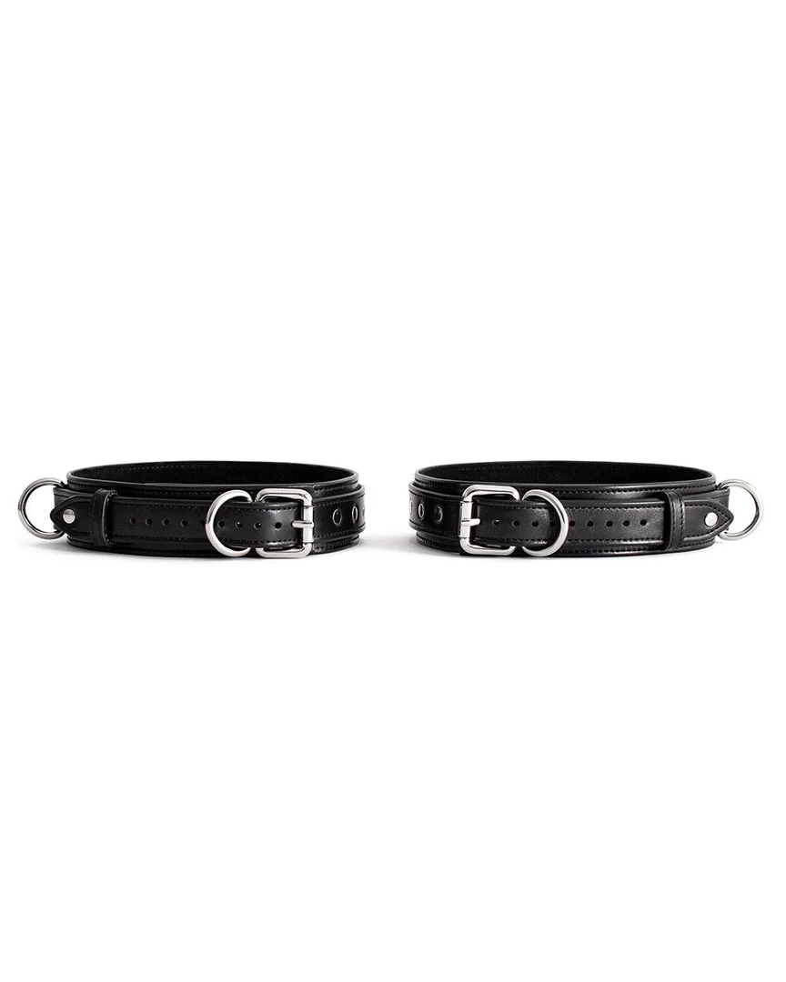 Thigh cuffs are made from soft matte leather and durable nickel-plated hardware that does not scratch the body while using. The width of the product allows you to use it without fear of leaving bruises. Adjust the size with a narrow strap and buckle. The product is equipped with two D-rings.