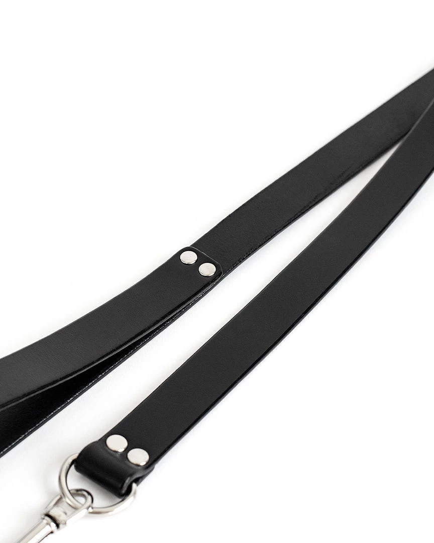 The leash is handcrafted from thick full-grain leather and nickel-plated hardware. The product consists of a long strap cut out of a whole leather piece. The end of the leash ends with a comfortable loop for holding the product in your hand. To another end of the leash a carabiner is attached, and which allows to connect the leash to the collar or other bondage fixations.